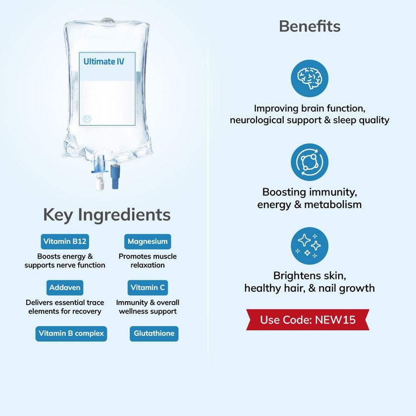 Disclaimer: This is a wellness IV drip administered by DHA-licensed nurses. It is not a medical treatment or cure. Not suitable for pregnant/breastfeeding women, or individuals with kidney, liver, or active infection conditions. Individual results may vary. For emergencies, seek immediate medical care.