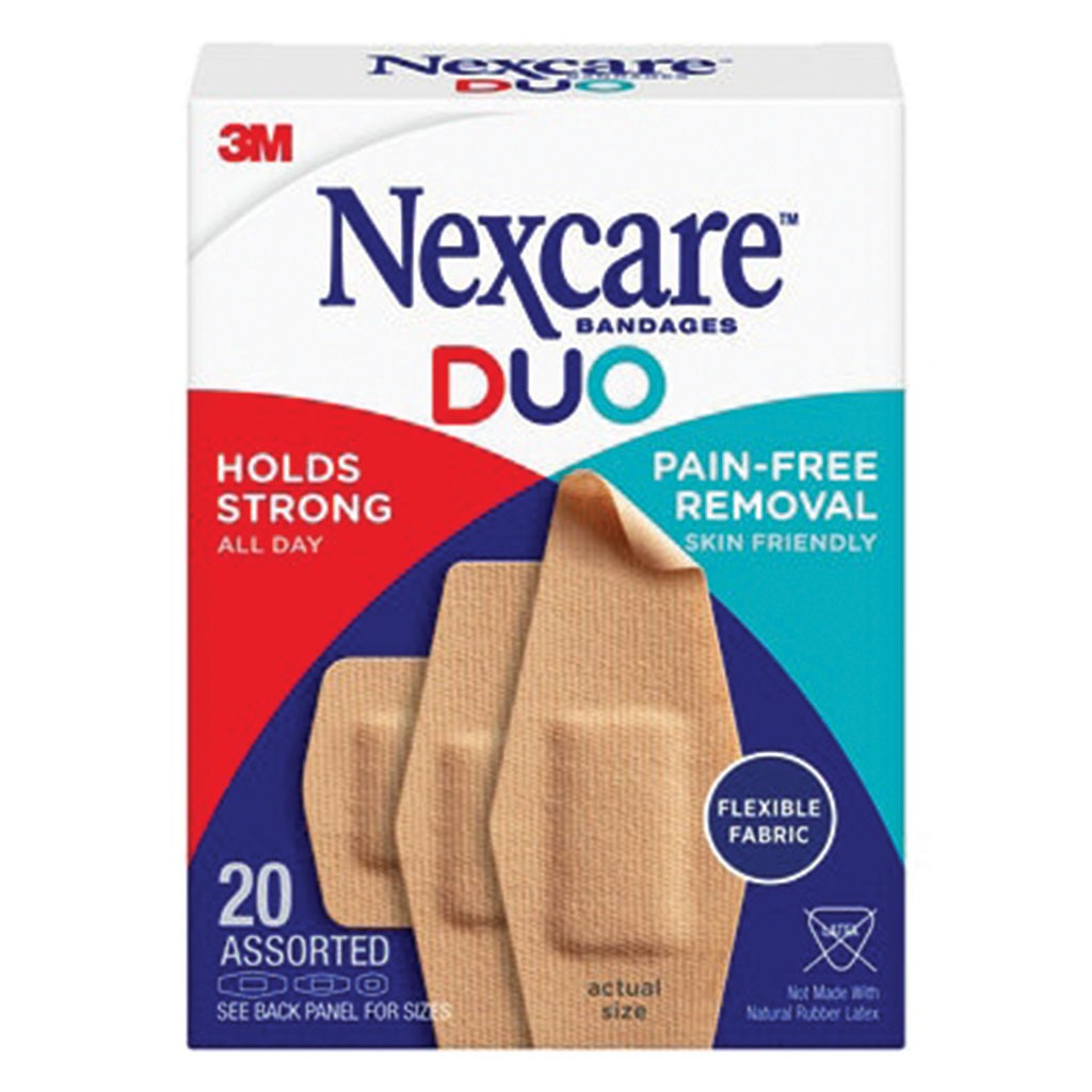 3M Nexcare Duo Flexible Fabric Bandages Assorted has long-lasting adhesive that allows for wear up to 24 hours, but is gentle enough to allow for easy removal, leaving no gunk. The flexible fabric strips conform to the skin - stretching, bending and flexing to move with you, while the pad cushions the wound. This 360-degree seal around pad covers and protects minor wounds.