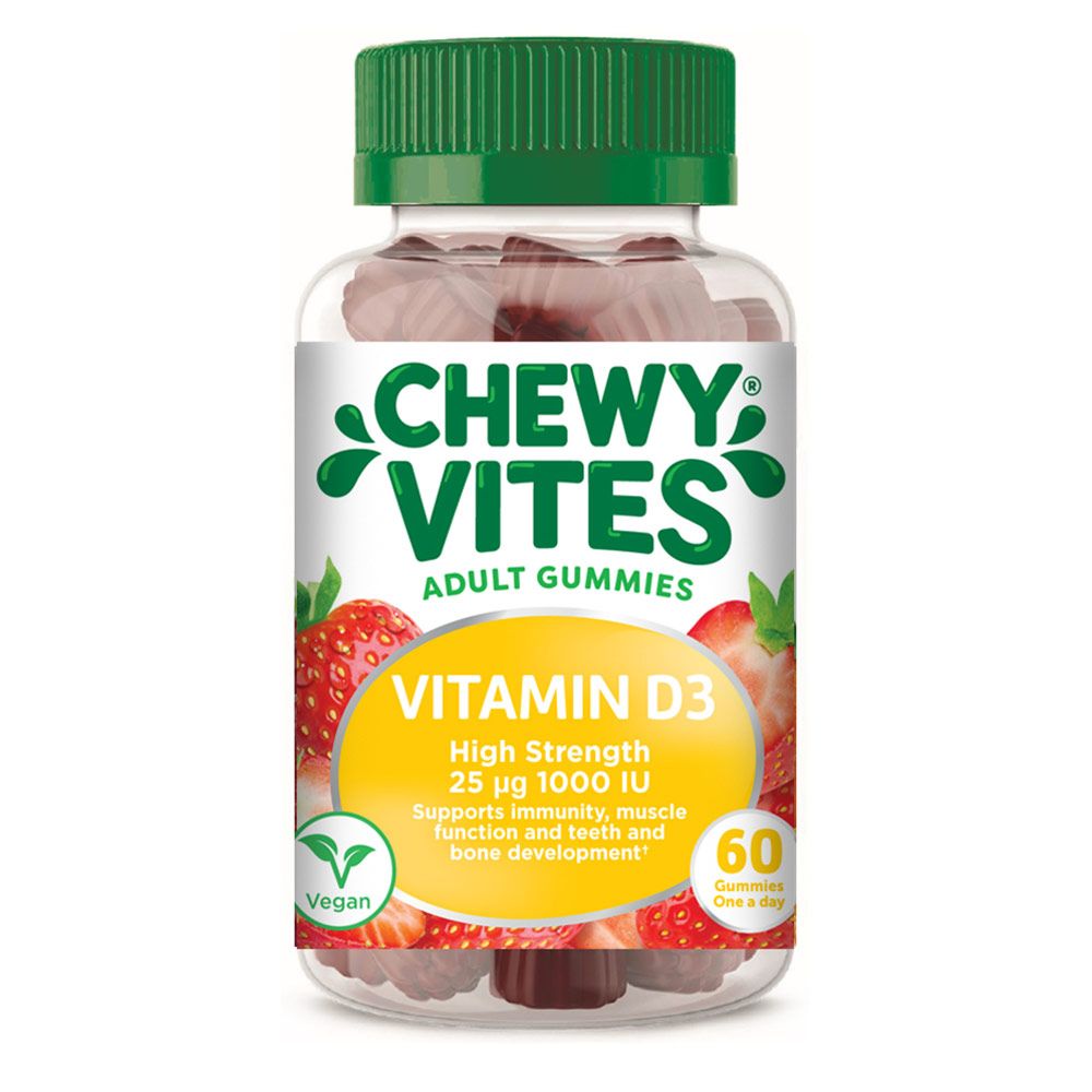 Chewy Vites Adults Vitamin D3 1000 IU Extra Strength Gummies are delicious fruity Gummies containing high strength vegan vit D3 to support immunity muscle function and teeth & bone development. Vitamin D3 is the body's preferred form of vitamin D, and that's why these gummies are specially formulated to provide 50 mcg (2000 IU) of D3 per serving. Vitamin D3 supports bone, teeth, muscle and immune health, it also helps improve calcium absorption.