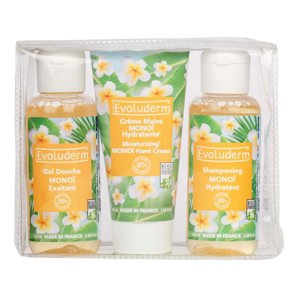 Evoluderm Travel Gift Box, Pack of Stimulating Monoi Shower Gel 100ml, Moisturizing Monoi Hand cream 50ml, Hydrating Monoi Shampoo 100ml