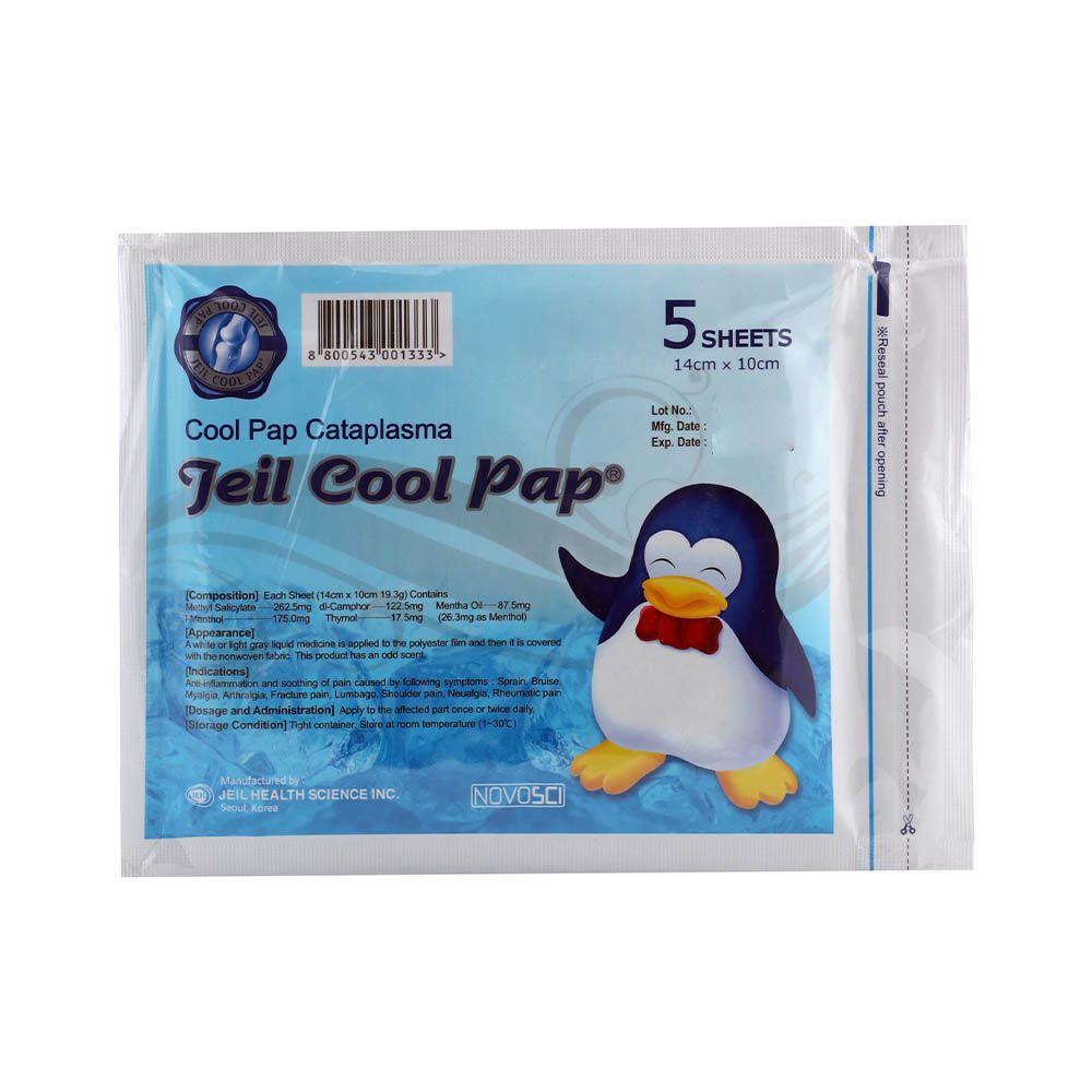 Jeil Cool Pap Pain Relieving Cataplasma Plaster is a medicated plaster used to control muscle pain resulting from torsion, bruising, sprains, myalgia and fractures as a result of the excellent combination of Methyl Salicylate, Menthol, Camphor, Mentha Oil and Thymol that offers on target delivery and excellent penetration of active ingredients; hence fast cooling and analgesic effect. Appearance: A white or light gray liquid medicine is applied to the polyester film and then it is covered with the nonwoven fabric.
