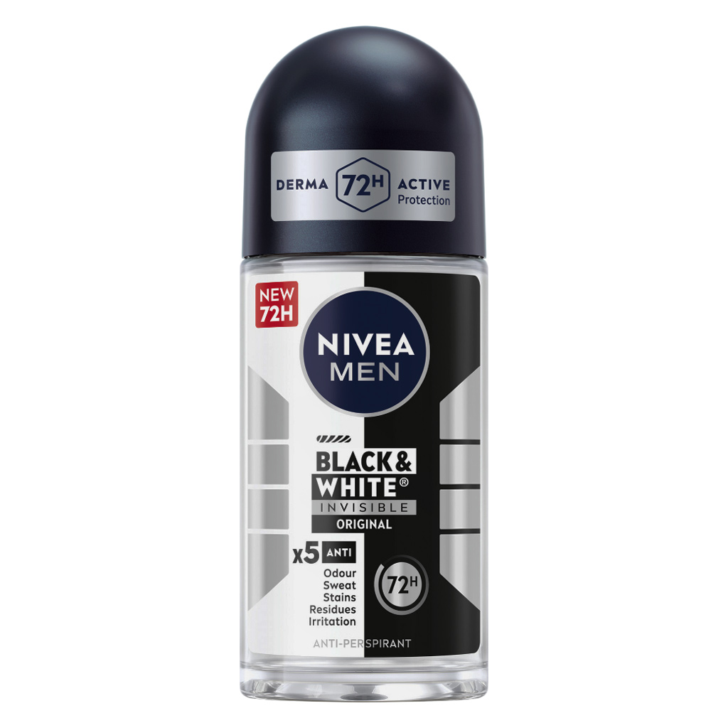 Nivea Men Black & White Invisible Original Antiperspirant Roll-On Deodorant for Men. Say goodbye to odour, sweat, stains, residues and irritation. Powered with 72 hours of active antiperspirant protection, this reliable deodorant delivers x5 anti-benefits, so you can stay fresh, dry and confident even on your active days. Worried about smelly underarms? This long-lasting deodorant with bold masculine fragrance keeps your underarms fresh with clean scent, so unpleasant smells don’t come in the way of your goals.