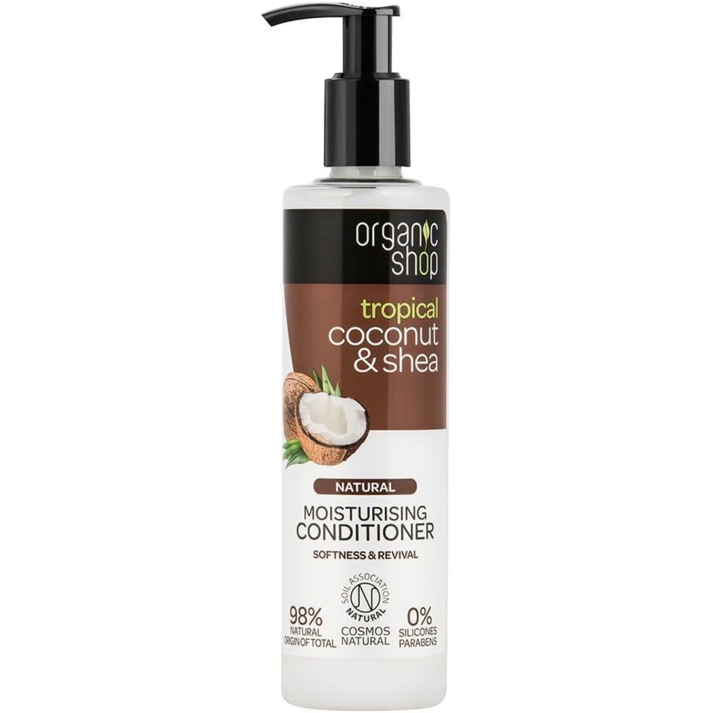 Organic Shop Coconut & Shea Moisturising Conditioner is an ultra-rich formula designed to deeply nourish and hydrate dry, damaged hair. Infused with organic coconut, this conditioner helps restore shine and strength, leaving hair lustrous and healthy. Organic shea provides essential hydration, repairing split ends and smoothing frizz for a rejuvenated and revived look. Ideal for dry and damaged hair, this conditioner contains no SLS, SLES, or parabens, and is made with 98% natural ingredients. It offers an effective solution to revive and maintain your hair’s softness and manageability, all while providing a tropical, luxurious experience.