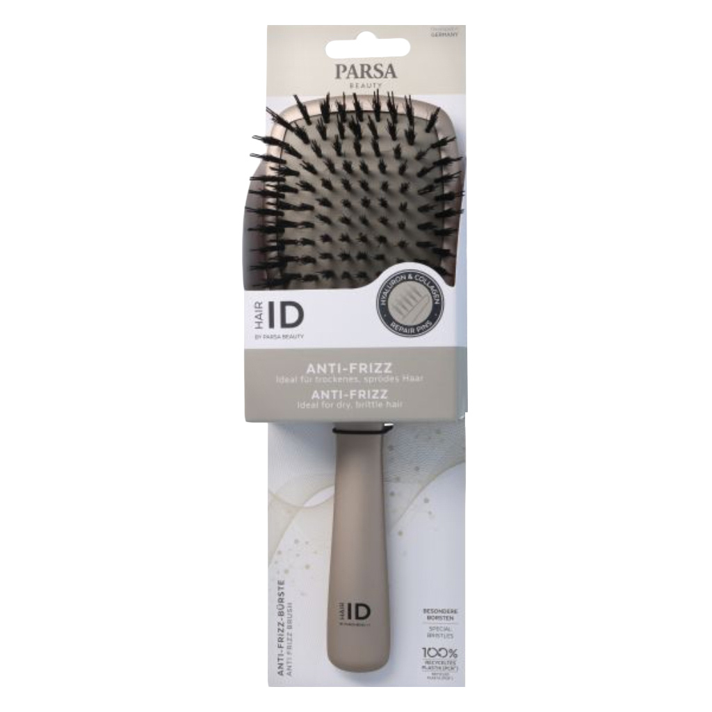 Parsa Beauty anti-frizz brush with Intense Repair Pins was developed especially for dry and frizzy hair. The special bristle technology helps tame frizzy hair and adds shine and softness. Enriched with moisturizing hyaluronic acid and nourishing collagen, the natural bristles condition the hair, while the additional V-pins reliably detangle it. In addition, the Active Ingredient + technology leads to healthy hair in two phases. The complementary active ingredients first build up the hair, thereby providing it with a protective coating. The brush with an ergonomic handle features a high-quality soft-touch coating for comfortable handling.