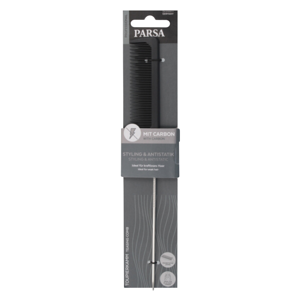 Parsa Beauty Carbon Toupee Hair Comb professional comb is suitable for styling, backcombing and lifting individual hair sections. The Black Needle Backing Comb is an anti-static backcomb, which is made of carbon fiber and a needle stem. The teasing comb has a total length of 23 cm, the comb length is approx. 8 cm, the comb width / height approx. 2.5 cm, and the length of the needle handle approx. 10.5cm. The comb teeth are alternately worked at three different heights and are very stable. In addition, the comb teeth in the tip are rounded and therefore gentle on the scalp. Thanks to the ultra-smooth surface of the comb teeth, the comb glides smoothly through the hair and ensures accurate work. The width, length and shape of the teeth determine the type of texture and thus characterize the individual look.