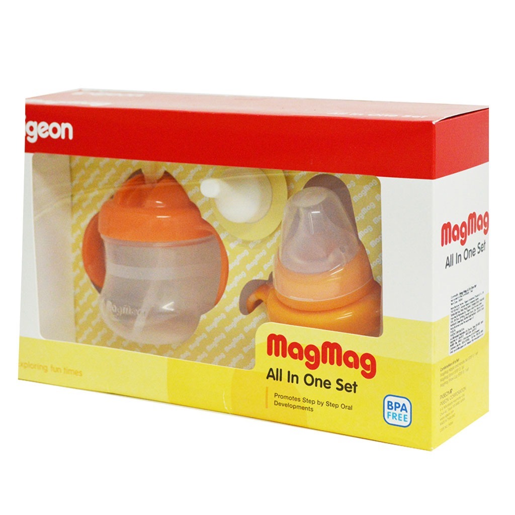 Pigeon Mag Mag All In One Set is designed to facilitate and enhance the development of baby's drinking skills by allowing a smooth transition from nipple to straw with its interchangeable drinking tops. MagMag All-in-One Set is a training cup that comes complete with all the 3 interchangeable tops for ease of training- nipple top, spout top and straw top. Starts with a nipple top in which the nipple designed to fit your baby's mouth as the baby transits from breastfeeding to bottle-feeding by using his first training cup with handles. Move on to spout top as your baby accustoms himself to drink from different shape other than nipple. Once your baby's sucking power gets stronger, train him to drink using straw, just like an adult.
