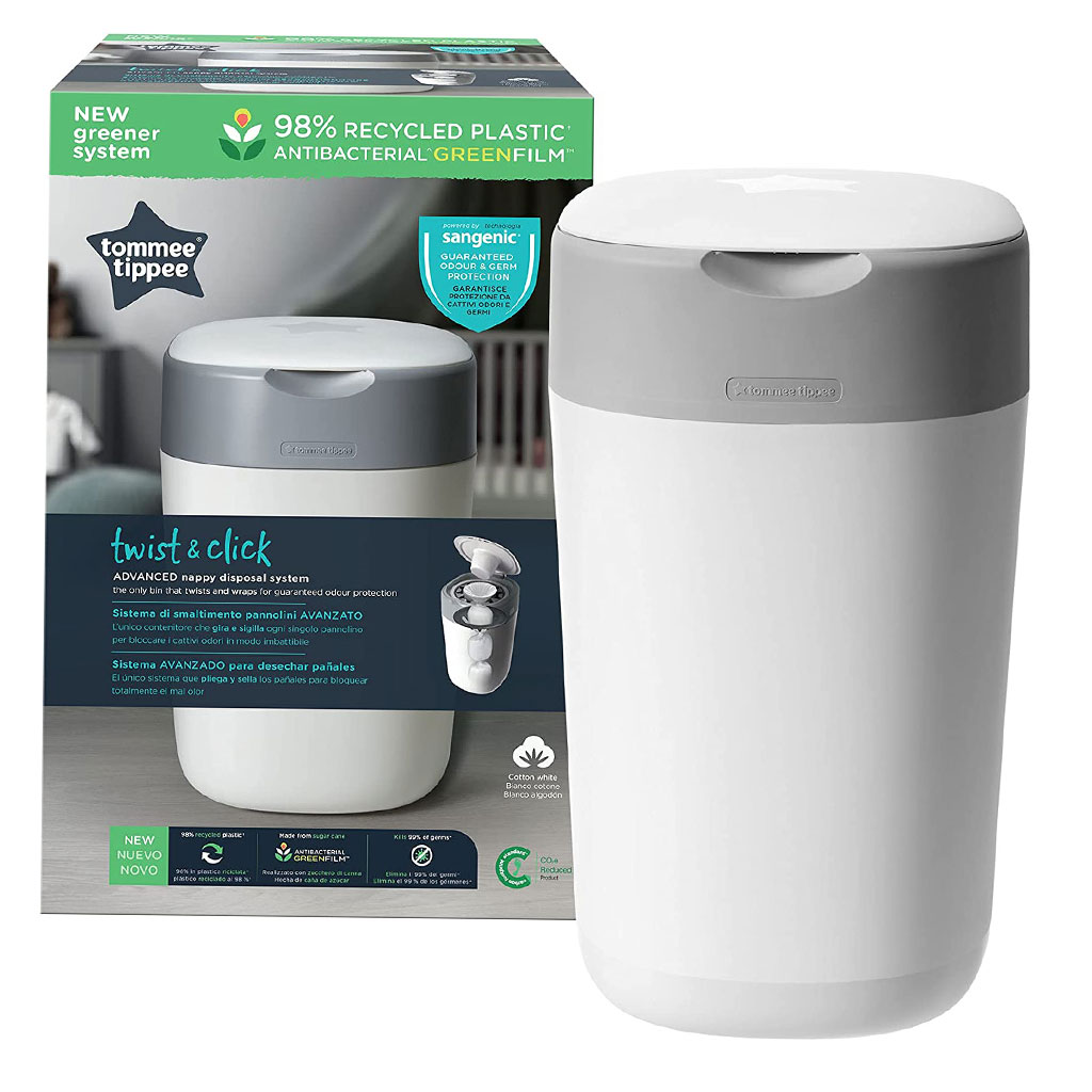 Tommee Tippee Twist And Click Advanced Nappy Bin-White is the only nappy bin to twist and individually wrap each nappy, safely sealing away odors and germs, keeping your home tidy and odor free. The multi-layer, anti-bacterial GREENFILM is 100x more effective than nappy sacks as it is Biomaster protected to kill 99% of dangerous germs like E-coli and Staphylococcus Aureus. On contact it stops proteins being broken down by bacteria, a process responsible for lots of nasty smells. The smart sealing lid encloses all unpleasant odors and the inbuilt plunger pushes nappies deep into the bin, keeping your hands clean. This nappy bin can hold up to 28 nappies at once, meaning fewer trips to the outside bin. The flat lid opens against any wall, making it easy to position and use. The nappy bin comes with one pre-loaded refill cassette and each refill provides enough anti-bacterial film to wrap up to 1 months’ worth of nappies depending on the size and number you use. Nappies are individually wrapped in multi-layer, antibacterial film that locks away odors and germs. The antibacterial film kills 99% of dangerous germs on contact, so bacteria and odors can’t escape, giving you guaranteed odor and germ protection every time you dispose of a nappy. It fits conveniently into any room. It holds up to 28 nappies at once, meaning fewer trips to the outside bin. The flat lid opens against any wall, making it easy to position and use.